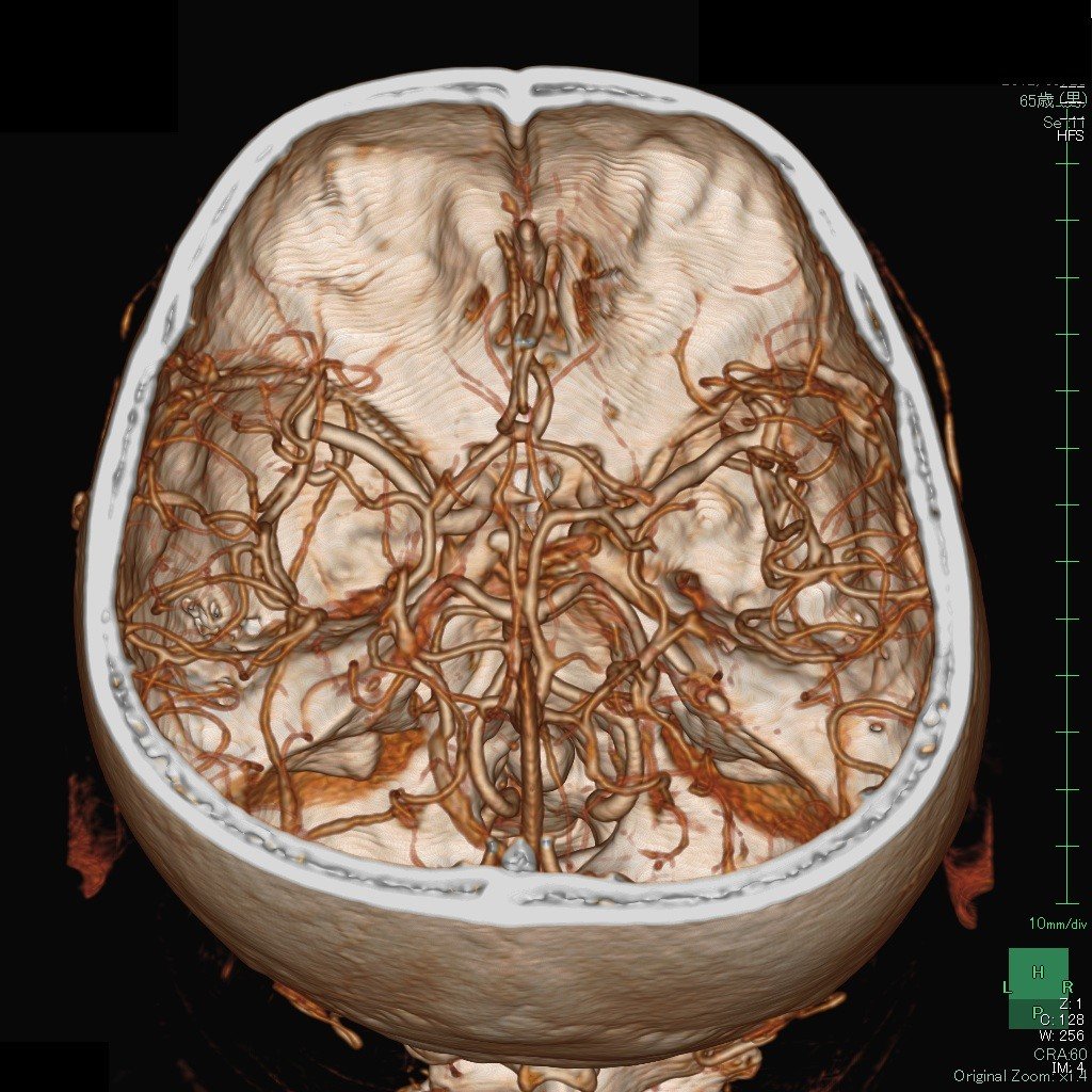 これは、造影剤を使って脳内の動脈を3Dで撮影した画像(3D-CTA)です。患者さんに説明するときにも、画面でmovieとしてお見せできます。