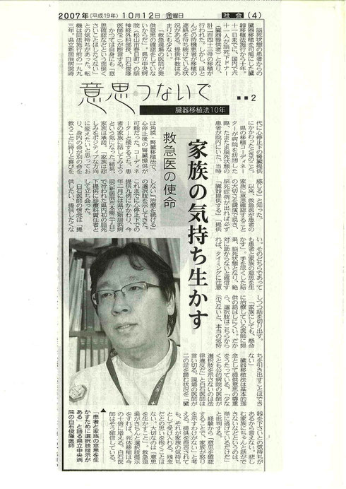 私は、2007年2月13日に愛媛県立新居浜病院に於いて、愛媛県初の「脳死移植」を経験いたしました。それまでにも数例の「心停止からの腎移植」には関わっておりました。当時の新聞記事の掲載を愛媛新聞社のご好意にて許可していただきましたので、ご紹介いたします。